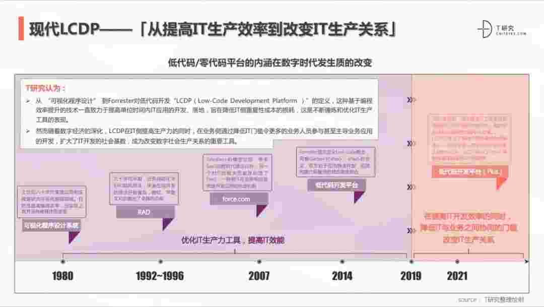 2020年前后,,,,源于提高IT工作者开发效能的LCDP不断进化和衍生,,,,面对业务导向日益明显的数字化变革。。LCDP衍生出了面向不同对象的升级服务——面向专业人群的LCDP和业务人群的NCDP,,LCDP与NCDP的不同服务属性被逐渐认可和接受。。 LCDP在提高IT开发效率的同时,,,降低IT与业务之间协同的门槛改变IT生产关系。。